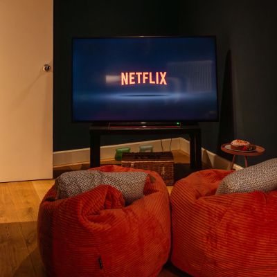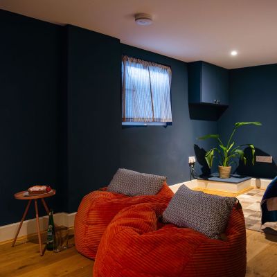 Spiral stairs down to Lower Ground Floor: Snug Dark, cosy and entirely its own world with beanbags, chill out day bed and large TV.