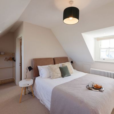 Stairs up to Third Floor: Door to 3rd Bedroom with king bed, wardrobe, side tables and en-suite with shower, toilet and basin. Sea-views.